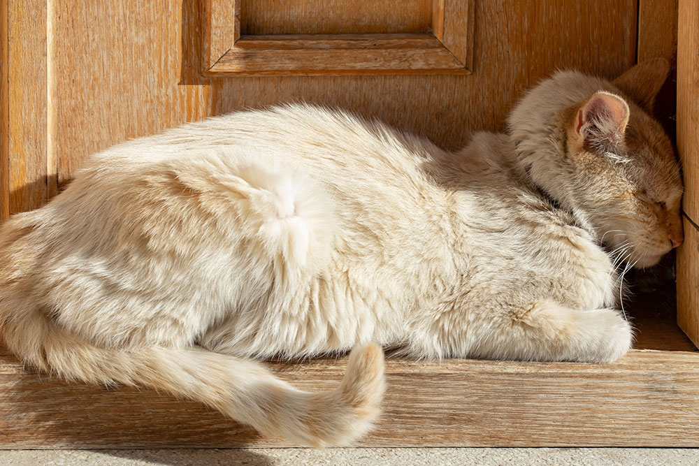 Cats often show stress through excessive grooming. Psychogenic alopecia is hair loss caused by licking or chewing driven by anxiety, not skin disease. Common feline life stressors include changes at home, new pets or people, outdoor cats near windows, or not enough enrichment.
